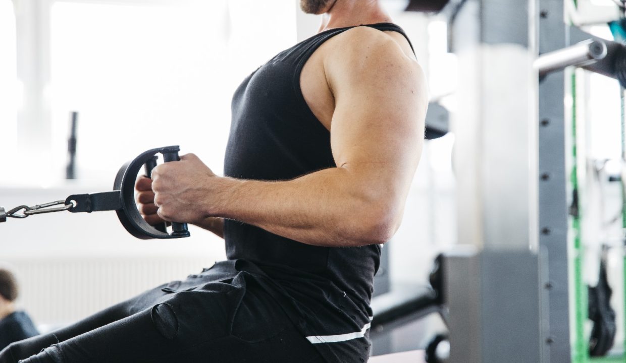 3. Com o core contraído e as costas retas, puxa o cabo em direção ao abdómen, aproximando as omoplatas e mantendo os cotovelos junto ao corpo.