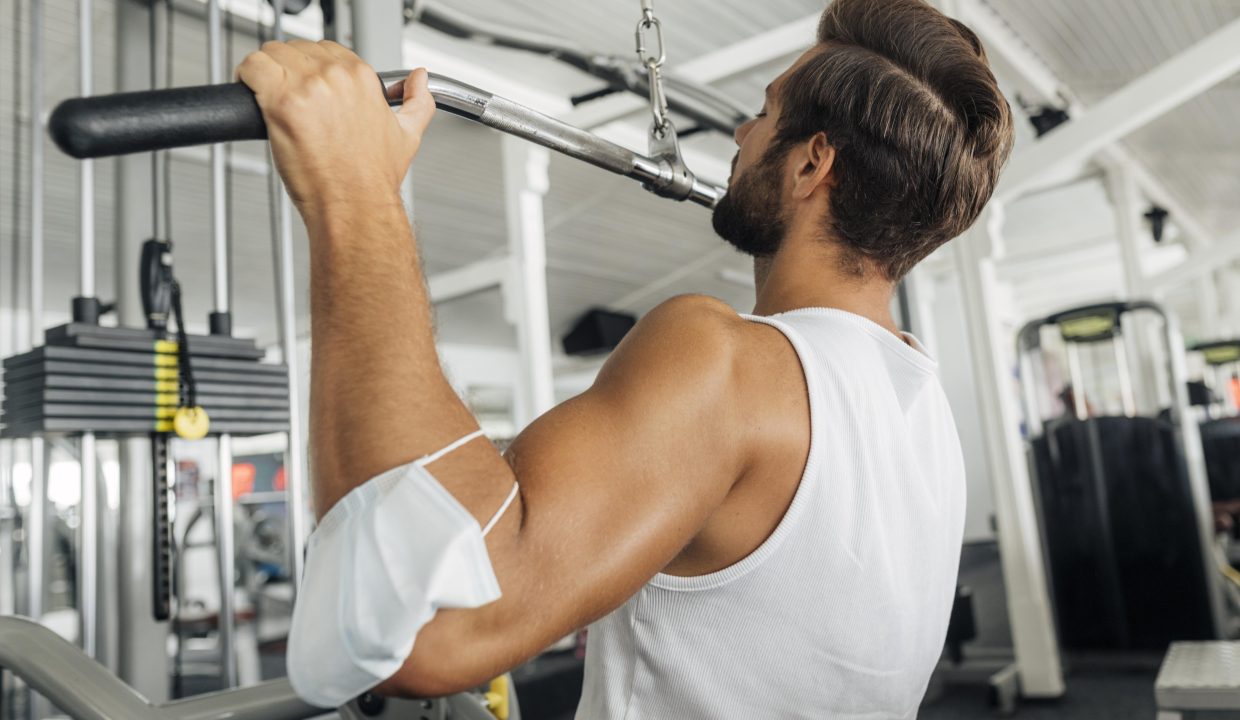4. Puxa a barra em direção à parte superior do peito, trazendo os cotovelos para baixo e para trás, sem balançar o corpo.